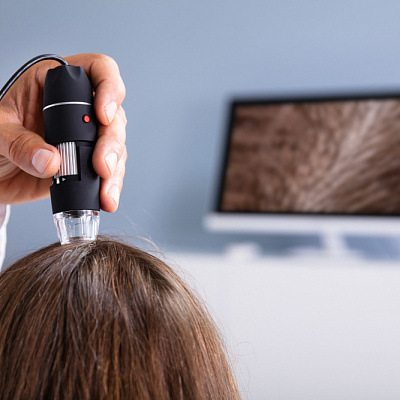 И тотальная, и очаговая алопецию у детей требует трихологической диагностики. Используется трихоскоп — устройство, за счет которого можно рассмотреть кожу головы и волосы при сильном увеличении. Назначается и трихограмма. Это микроскопическое исследование извлеченных корней волос, помогающее найти исказившуюся фазу роста.