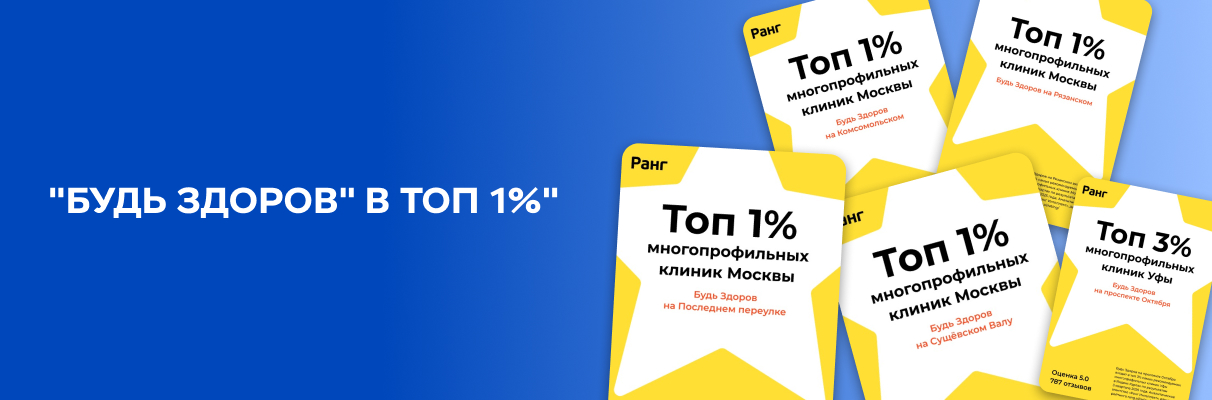 В ТОП 1% среди самых рекомендуемых многопрофильных клиник Москвы вошли клиники «Будь Здоров» на Рязанском проспекте, Сретенке, Сущевском Валу и Фрунзенской. Клиника «Будь Здоров» в Уфе вошла в ТОП 3% рейтинга.
